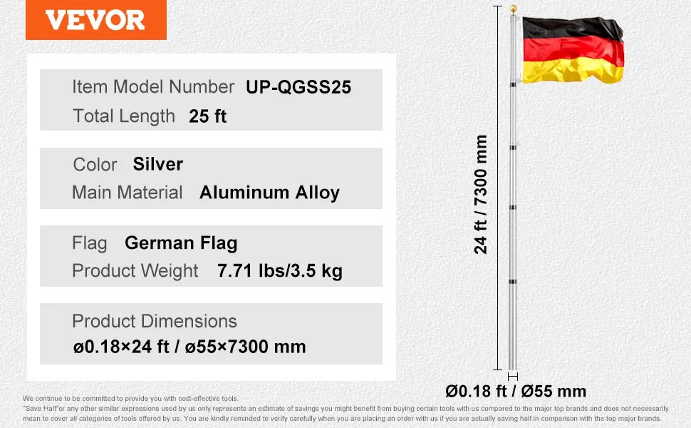 VEVOR 25ft Teleskop-Fahnenmast-Set, robustes Fahnenmast-Set aus Aluminiumlegierung im Boden für draußen, 3 Anzeigemodi Fahnenmast mit professionellem Zubehör, deutsche Flagge, Silber