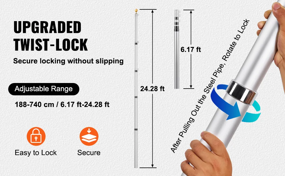 Teleskopeinstellung: Unser Fahnenmast ist mit 5 Abschnitten ausgestattet und kann bis zu 25 Fuß (7,62 m) ausgefahren werden. Ein verbesserter Drehverschlussmechanismus sorgt für eine sichere Verriegelung, um ein Verrutschen zu verhindern, und ermöglicht ein einfaches Entriegeln. Sein flexibles Teleskopdesign passt sich verschiedenen Anforderungen an, erleichtert die Lagerung, den Transport und erfüllt die Anforderungen an die Tragbarkeit.