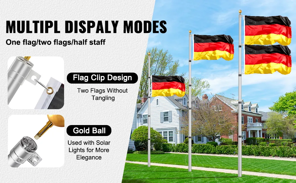 Mehrere Anzeigeoptionen: Unser Teleskop-Fahnenmast unterstützt die Anzeige von 1 Flagge, 2 Flaggen und sogar Halbmastflaggen und eignet sich für verschiedene Einsatzszenarien. Ob in Höfen, auf Plätzen oder in Gewerbeflächen, unser Produkt bietet die am besten geeigneten Anzeigeoptionen für Ihre Anforderungen.
