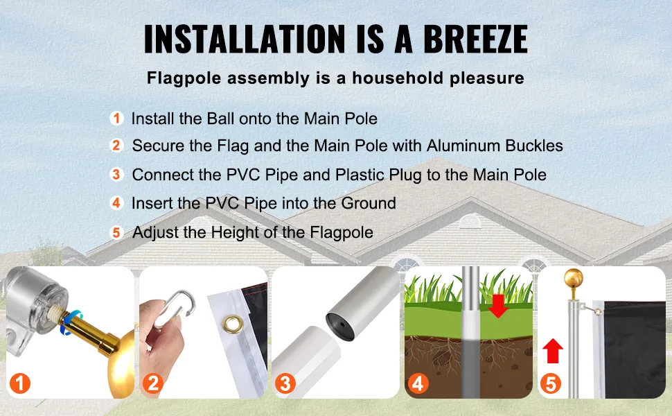 Von der Montage der goldenen Kugel am Hauptmast über die Befestigung der Flagge mit Aluminiumklammern bis hin zum Einführen der PVC-Rohre in den Boden ist alles unkompliziert, sodass Sie den DIY-Prozess genießen können.