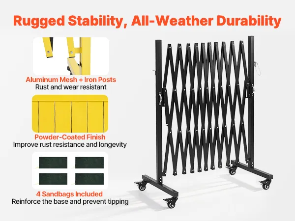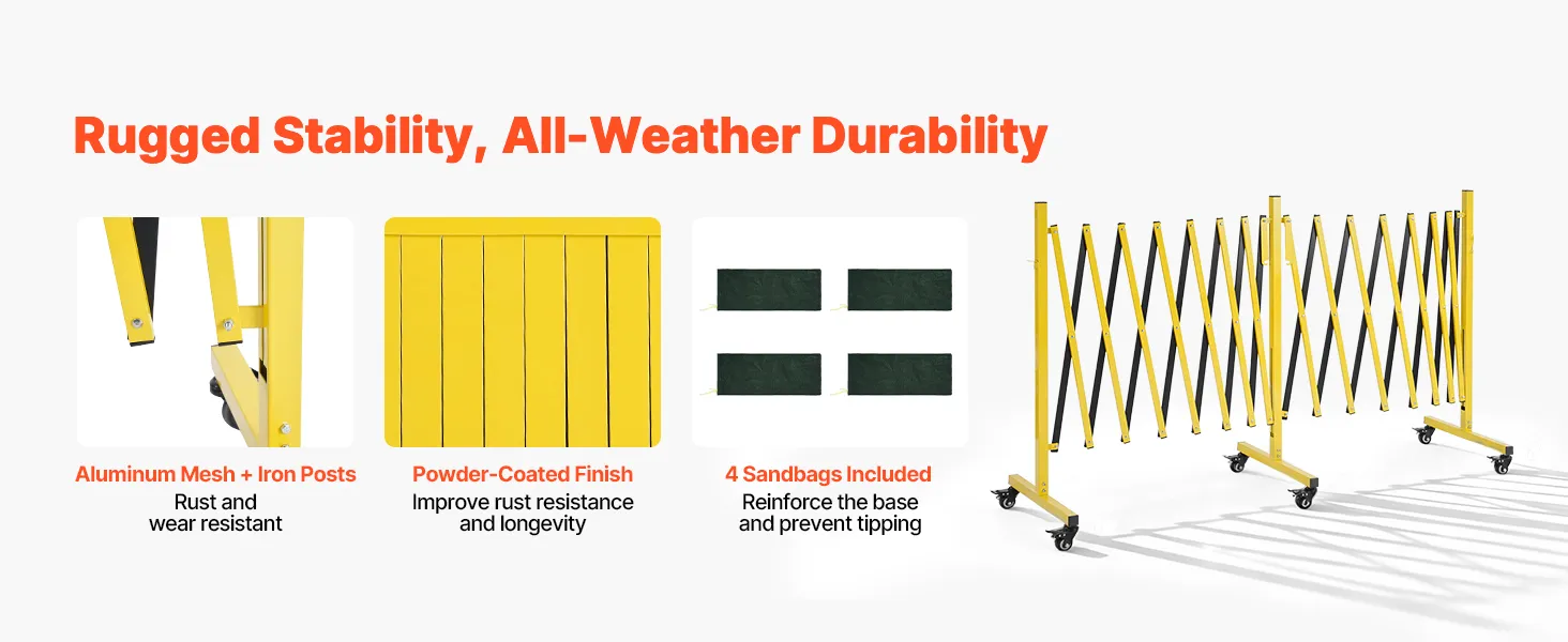 • Robust und langlebig: Unseres ausziehbare Absperrgitter besteht aus Aluminiumgewebe und Eisenpfosten mit einer pulverbeschichteten Oberfläche für lange Haltbarkeit. Vier Sandsäcke sind im Lieferumfang enthalten, um die Stabilität zu erhöhen und ein Umkippen bei Wind und Regen zu verhindern
