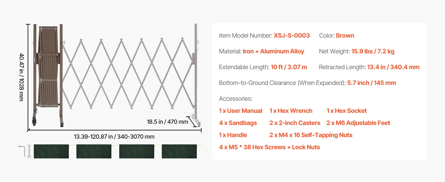 • Absperrbereiche absperren: Die ausziehbare Absperrung von VEVOR ermöglicht die schnelle Errichtung einer Sicherheitsbarriere, um Gefahren abzusperren und Personen oder die Umgebung zu schützen. Ausziehbare Länge: 3,07 m (10 Fuß), Eingefahrene Länge: 340,4 mm (13,4 Zoll), Höhe: 1028 mm (40,5 Zoll)