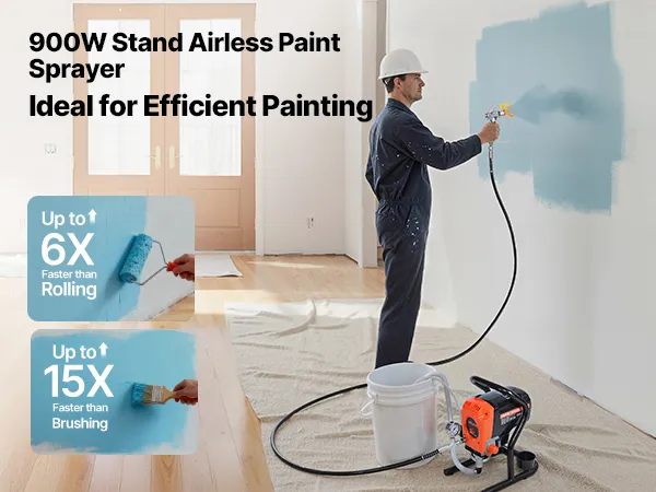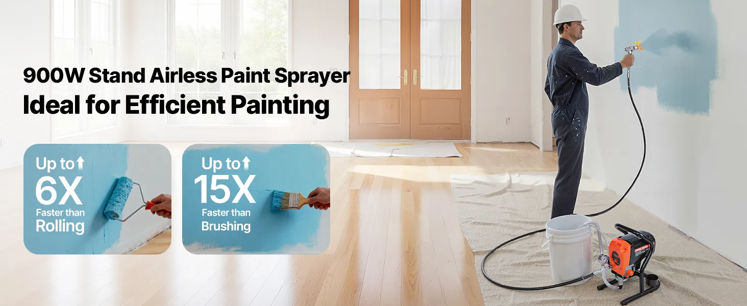 Efficient Coating: The 900W motor, 0.47 GPM flow, and 3300 PSI pressure deliver spraying speeds 6x faster than rollers and 15x faster than brushes. Our stand airless paint sprayer is ideal for large-scale projects like townhouses and factory buildings