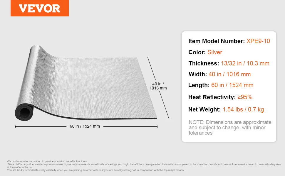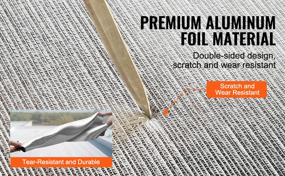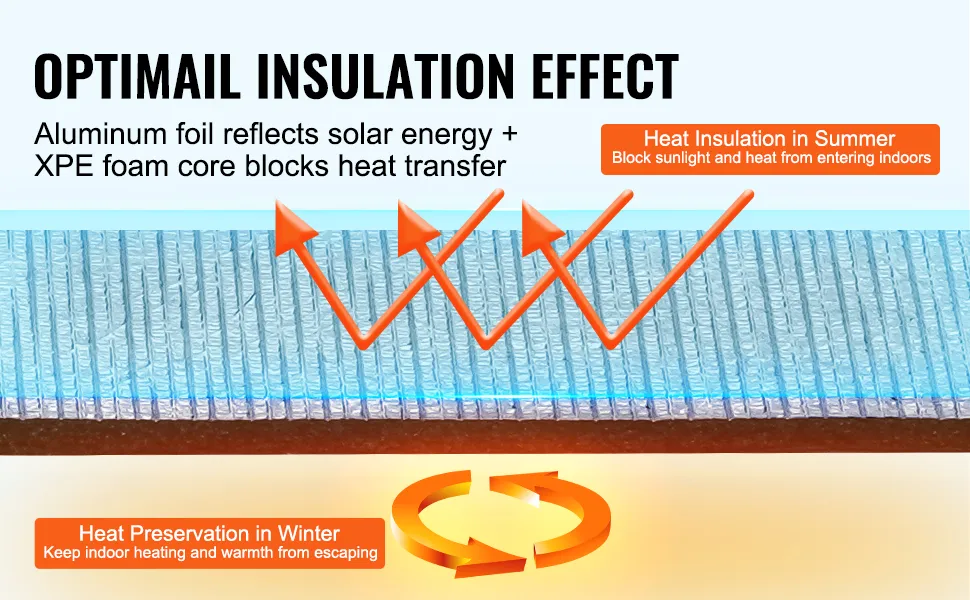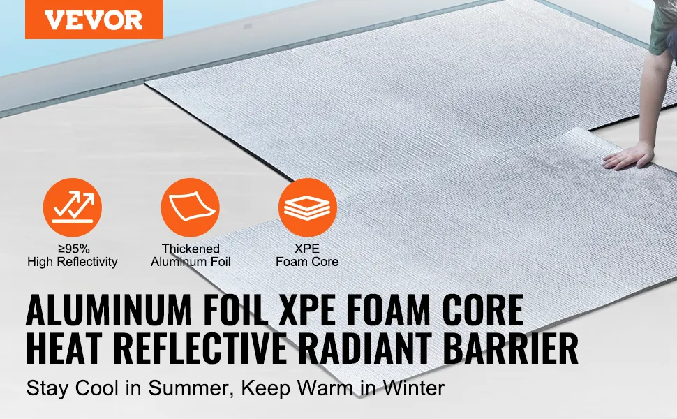 Die reflektierende Isolierrolle von VEVOR weist eine Reflektivität von ≥ 95 % auf und besteht aus hochwertiger Aluminiumfolie und einem Kern aus XPE-Schaum. Sie blockiert im Sommer effektiv das Sonnenlicht und verhindert im Winter den Wärmeverlust im Innenbereich.
