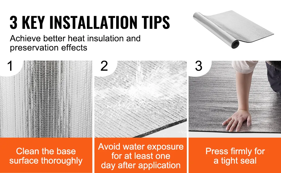 3 Tipps zur Installation: Sorgen Sie für eine saubere und trockene Grundfläche, lassen Sie das Material nach der Installation mindestens einen Tag lang keinem Wasser ausgesetzt und drücken Sie fest, um eine dichte Abdichtung und optimale Dämmleistung zu erzielen.