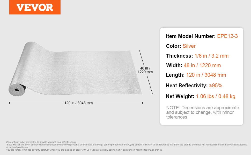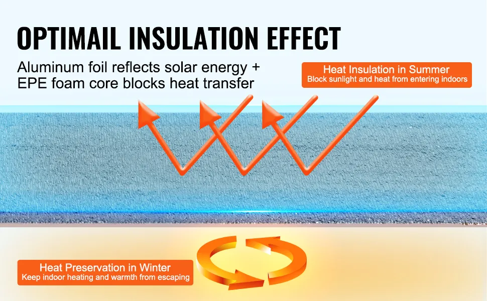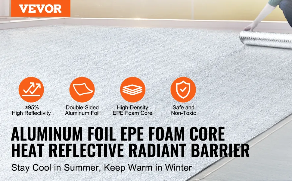 Die Isolierrolle von VEVOR weist eine hohe Reflektivität von ≥ 95 % auf und besteht aus doppelt reflektierender Aluminiumfolie und einem Kern aus hochdichtem EPE-Schaum. Sie blockiert im Sommer effektiv das Sonnenlicht und verhindert im Winter den Wärmeverlust im Innenbereich.