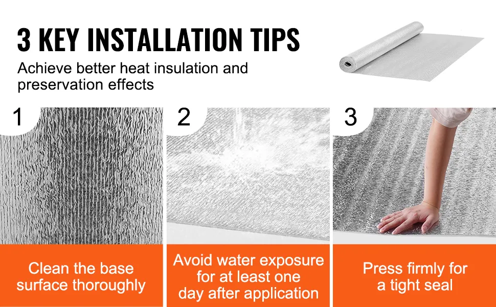 3 Tipps zur Installation: Sorgen Sie für eine saubere und trockene Grundfläche, lassen Sie das Material nach der Installation mindestens einen Tag lang keinem Wasser ausgesetzt und drücken Sie fest, um eine dichte Abdichtung und optimale Dämmleistung zu erzielen.