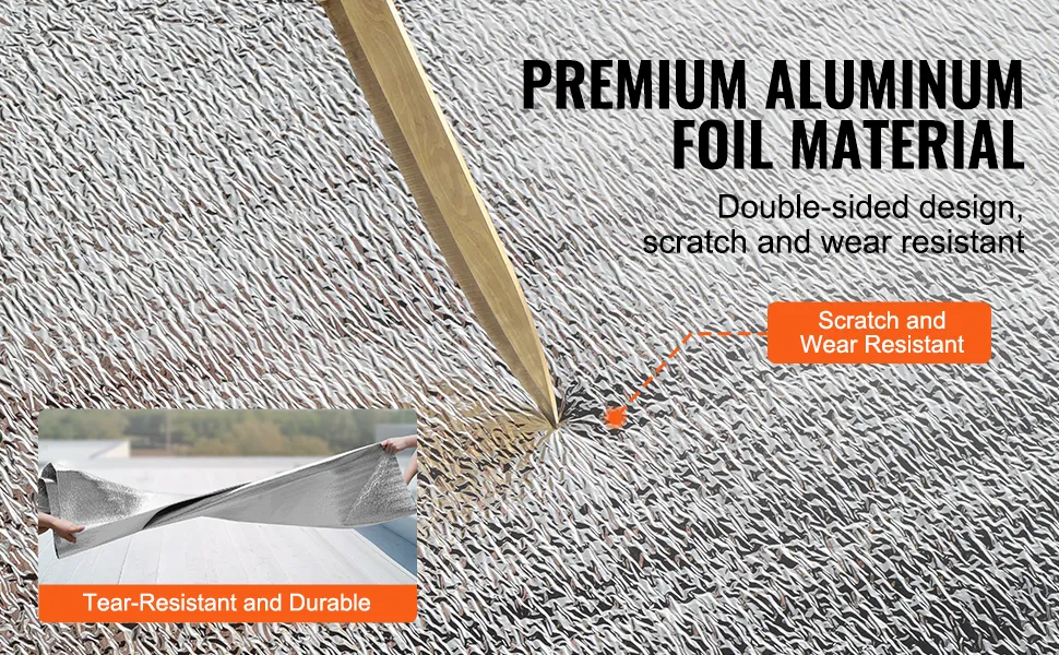 Die Isolierrolle von VEVOR weist eine hohe Reflektivität von ≥95 % auf und besteht aus doppelt reflektierender Aluminiumfolie und einem Kern aus hochdichtem EPE-Schaum. Sie blockiert im Sommer effektiv das Sonnenlicht und verhindert im Winter den Wärmeverlust im Innenbereich.