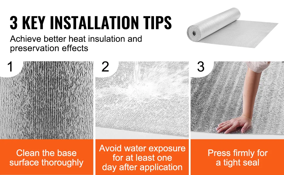 3 Tipps zur Installation: Sorgen Sie für eine saubere und trockene Grundfläche, lassen Sie das Material nach der Installation mindestens einen Tag lang keinem Wasser ausgesetzt und drücken Sie fest, um eine dichte Abdichtung und optimale Dämmleistung zu erzielen.