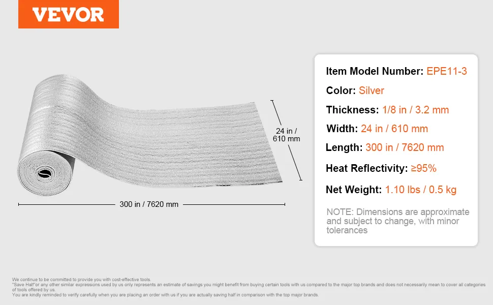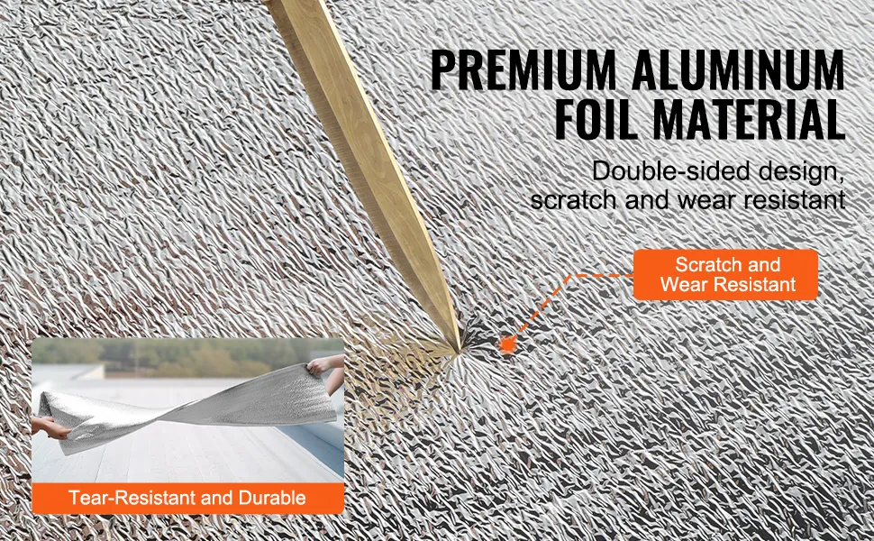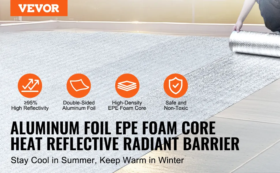 Die Isolierrolle von VEVOR weist eine hohe Reflektivität von ≥95 % auf und besteht aus doppelt reflektierender Aluminiumfolie und einem Kern aus hochdichtem EPE-Schaum. Sie blockiert im Sommer effektiv das Sonnenlicht und verhindert im Winter den Wärmeverlust im Innenbereich.