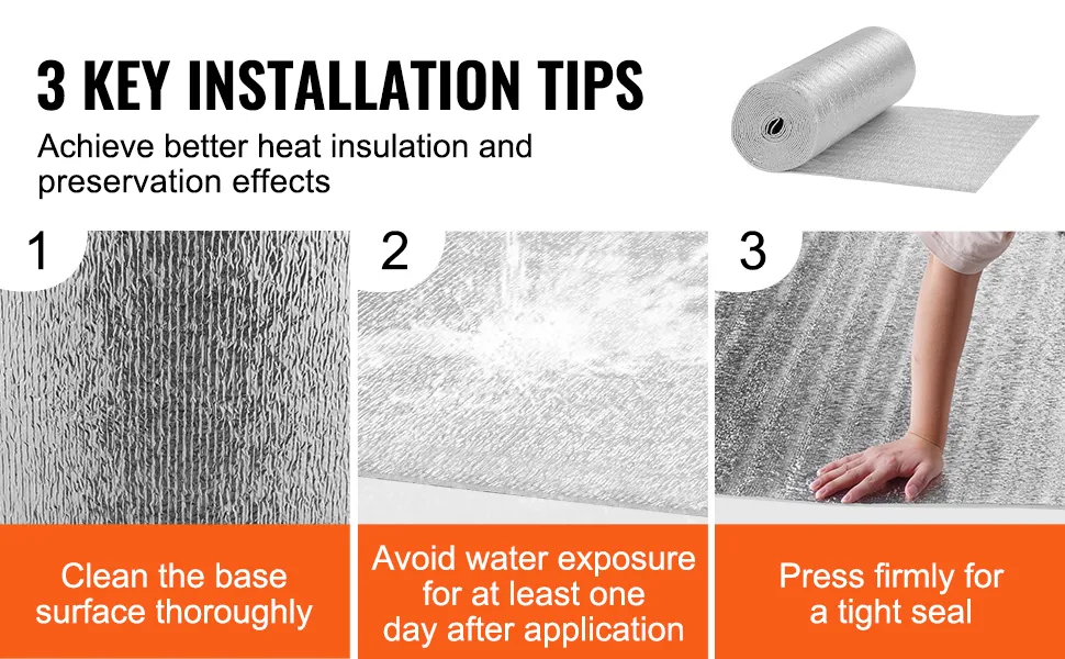 3 Tipps zur Installation: Sorgen Sie für eine saubere und trockene Grundfläche, lassen Sie das Material nach der Installation mindestens einen Tag lang keinem Wasser ausgesetzt und drücken Sie es fest an, um eine dichte Abdichtung und optimale Dämmleistung zu erzielen.
