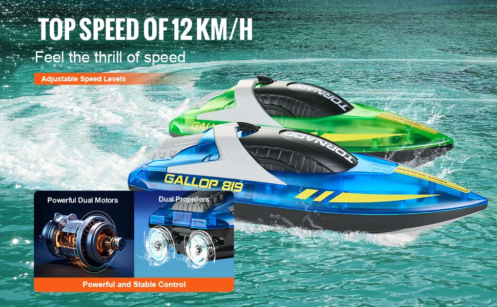Dank der Doppelmotoren und Propeller bietet dieses ferngesteuerte Boot eine starke, stabile Leistung und erreicht Geschwindigkeiten von bis zu 12 km/h. Es ist perfekt, um jede Wasseraktivität spannender und unterhaltsamer zu gestalten.