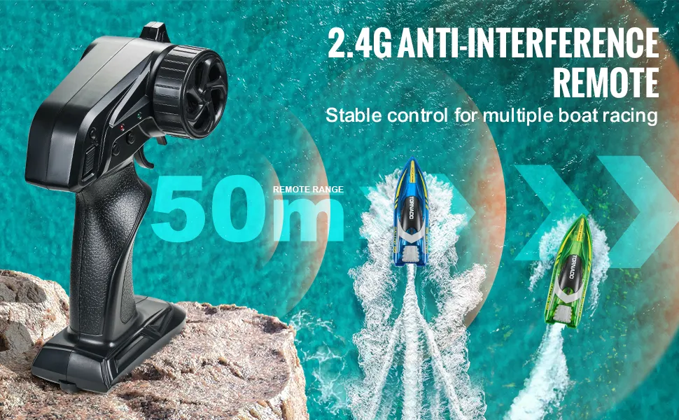 Das ferngesteuerte Boot verfügt über 2,4-G-Technologie für eine reibungslose Steuerung bis zu einer Entfernung von 50 m. Es eignet sich hervorragend für mehrere Bootsrennen und verfügt über eine Reichweitenwarnung, damit das Boot sicher in Reichweite bleibt.