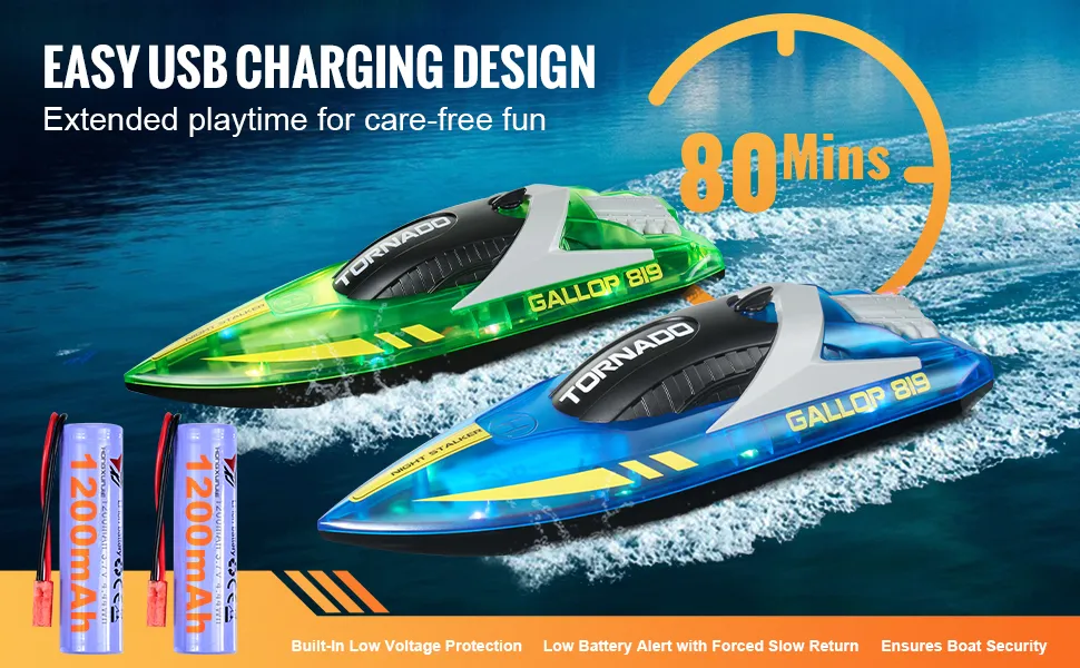 Dank USB-Aufladung und Doppelbatteriesystem bietet dieses ferngesteuerte Boot über 80 Minuten Spielzeit. Bringen Sie eine Powerbank für endlosen Spaß bei Outdoor-Abenteuern mit.