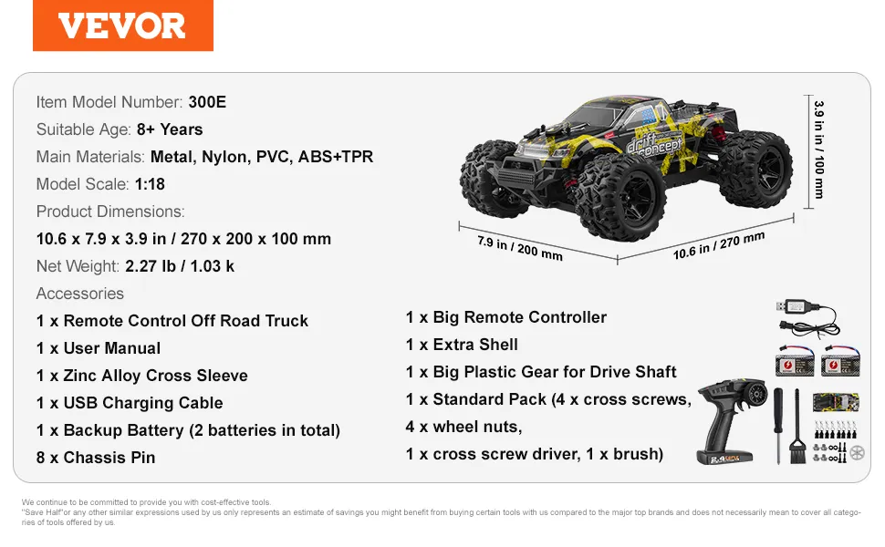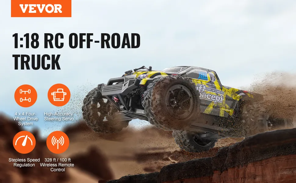 Das RC-Geländeauto im Maßstab 1:18 von VEVOR verfügt über eine Metallantriebswelle, einen bürstenlosen Motor mit 20.000 U/min, eine stufenlose Geschwindigkeitsregelung und Reifen mit hohem Grip, mit denen Sie jedes Gelände erobern können.