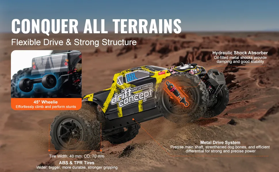 Ultimativer Fahrspaß: Dieses RC-Geländeauto ist mit einer Wheelie-Bar ausgestattet und kann seine Vorderräder bis zu 45° anheben, sodass die Stabilität für beeindruckende Stunt-Leistungen erhalten bleibt. In Kombination mit einem Lenkwinkel von 45°, einem hochpräzisen Servo und einem hydraulischen Stoßdämpfer meistert es scharfe Kurven, erklimmt steile Hänge und bewältigt unwegsames Gelände mit Leichtigkeit und bietet so ein unvergleichliches Rennerlebnis