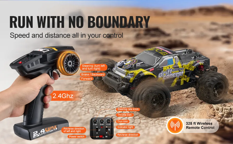 Bessere Erlebnisse: Mit der Wasserdichtigkeitsklasse IPX4, einer Fernbedienung mit einer Reichweite von 100 m, einer hochpräzisen Hauptwelle, einem verstärkten Knochen, einem effizienten Differential, Frontlichtern und einem langlebigen Chassis aus Nylon und Kohlenstoffstahl ist jedes durchdachte Detail darauf ausgelegt, den perfekten Hobby-RC-Truck für Kinder zu schaffen und ihnen noch mehr aufregende Abenteuer zu bieten