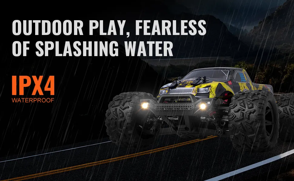 Machen Sie sich keine Sorgen über regnerische Tage oder schlammige Orte, dank der wasserdichten Funktion IPX4 bringt unser ferngesteuerter Monstertruck Ihren Spaß an Erkundungen im Freien mit Sicherheit auf die nächste Stufe.