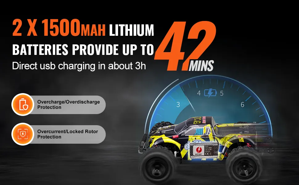 Weniger Laden, längerer Rennspaß: Mit zwei 1500-mAh-Lithiumbatterien bietet dieser geländegängige RC-Truck starke und anhaltende Leistung, sodass Kinder bis zu 42 Minuten Rennspaß haben. Mit einem leicht zugänglichen USB-Anschluss für verschiedene Stromversorgungen (einschließlich Powerbank) und einer Schnellladefunktion ist das Geländeauto in nur etwa 3 Stunden wieder auf der Strecke