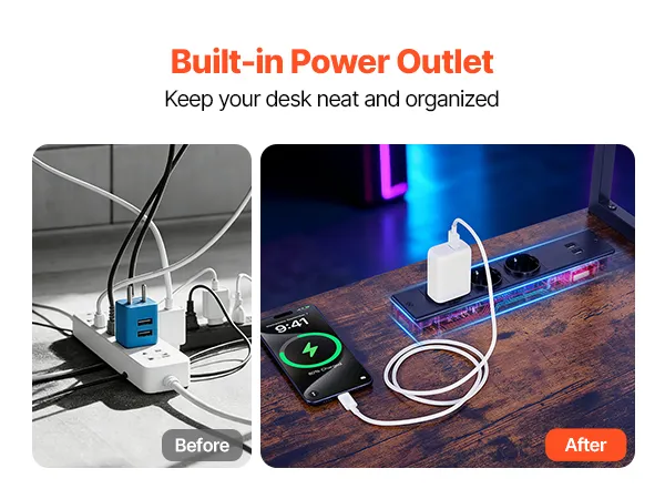 Integrierte Steckdose: Laden Sie Ihre Geräte bequem über 3 AC- und 2 USB-Anschlüsse auf und halten Sie Ihren Gaming- oder Homeoffice-Schreibtisch aufgeräumt und bereit zum Arbeiten oder Spielen