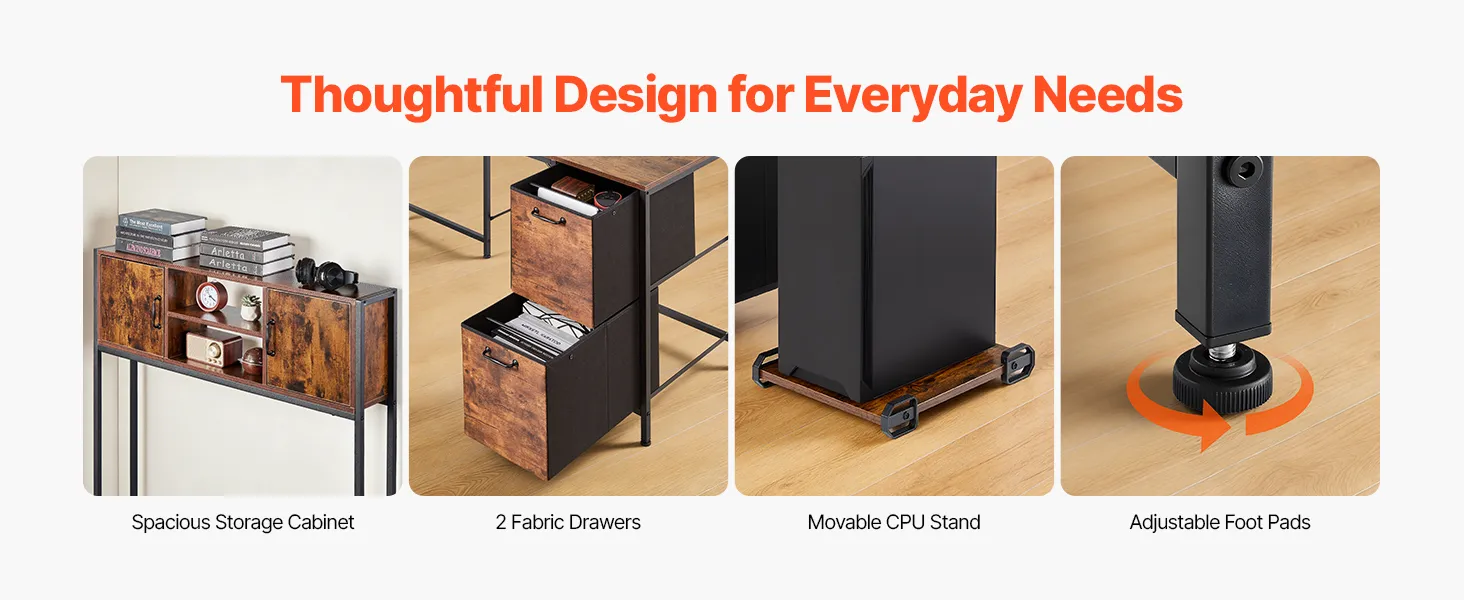 Großzügiger Stauraum: Dieser L-förmige Eck-Computertisch verfügt über zwei geräumige Schränke und zwei Stoffschubladen für flexible Organisation, sodass Sie wichtige Utensilien ordentlich verstauen und häufig verwendete Gegenstände griffbereit haben können