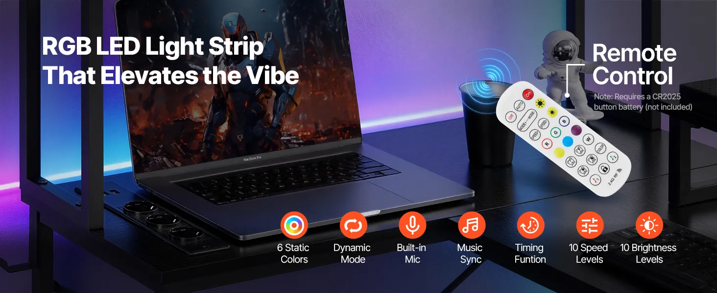 Ein integrierter, farbenfroher RGB-Lichtstreifen mit mehreren Beleuchtungsmodi ermöglicht es Ihnen, das Ambiente Ihres Gaming-Tisches individuell anzupassen und so eine immersive Atmosphäre zum Spielen oder Arbeiten zu schaffen.