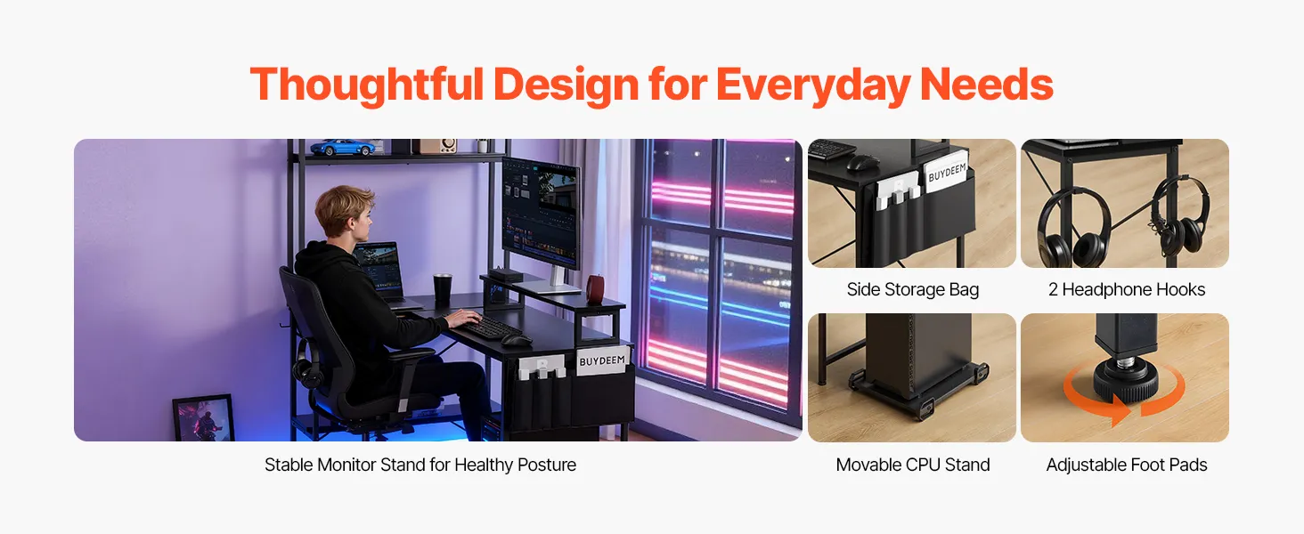 Durchdachte Designmerkmale: Der verschiebbare CPU-Ständer ermöglicht eine flexible Positionierung des Towers, während der Monitorständer den Betrachtungskomfort verbessert und Platz auf dem Schreibtisch schafft, sodass Ihr Arbeitsplatz aufgeräumt bleibt. Ein moderner PC-Schreibtisch wertet Ihren Raum mit Stil und Funktionalität auf