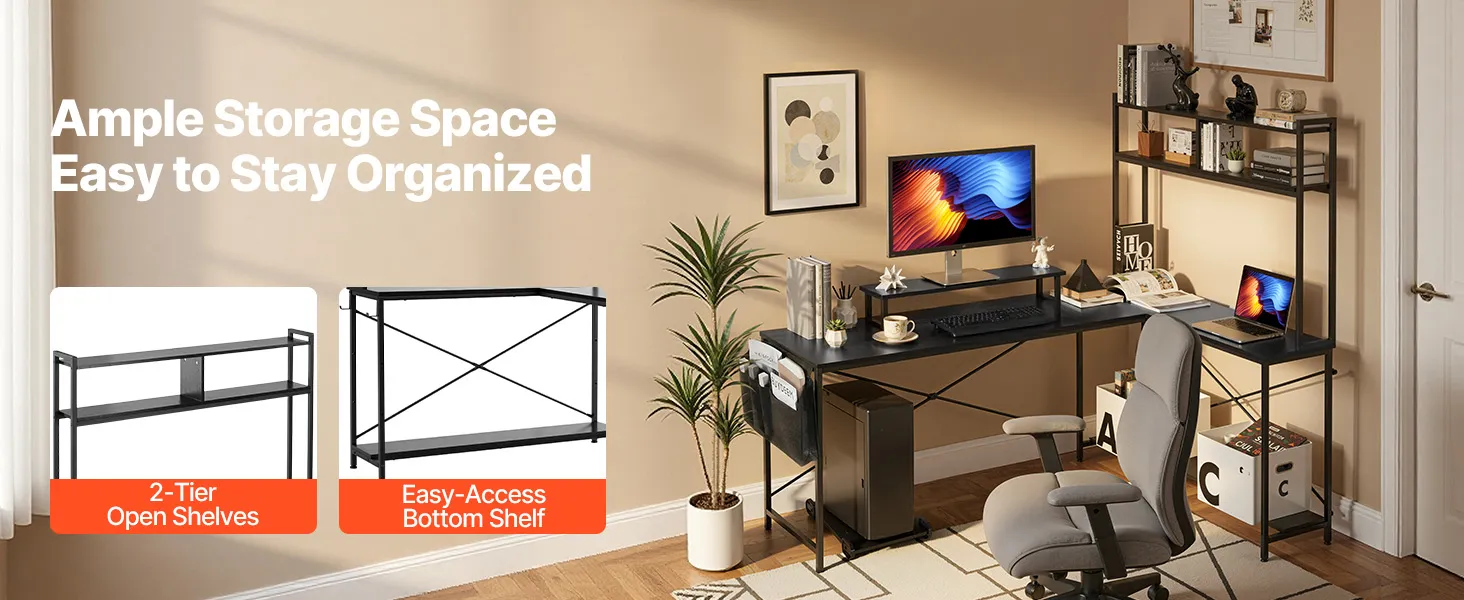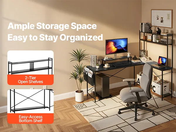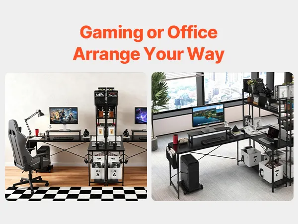 • Großzügiger Stauraum: Dieser L-förmige Eck-Gaming-Schreibtisch bietet zwei offene Regalböden, einen dreifach verstellbaren unteren Regalboden, eine seitliche Aufbewahrungstasche und zwei Kopfhörerhaken für flexible Aufbewahrungsmöglichkeiten. So bleiben Ihre wichtigsten Utensilien ordentlich verstaut und häufig genutzte Gegenstände stets griffbereit