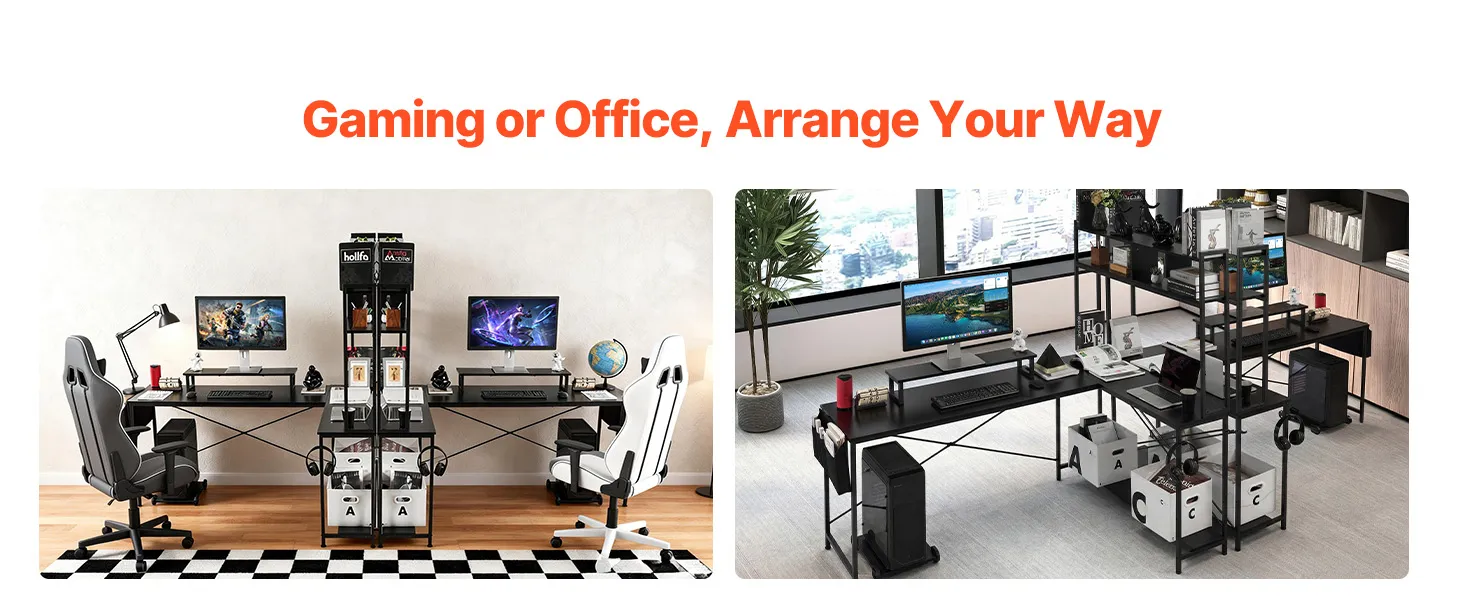 Dieser Gaming-PC-Schreibtisch verfügt über ein zweistufiges oberes Regal und ein dreistufig verstellbares unteres Regal und bietet reichlich Platz zum Organisieren von Büchern, Zubehör und wichtigen Dingen. So bleibt Ihr Schreibtisch ordentlich und alle Gegenstände sind leicht erreichbar.