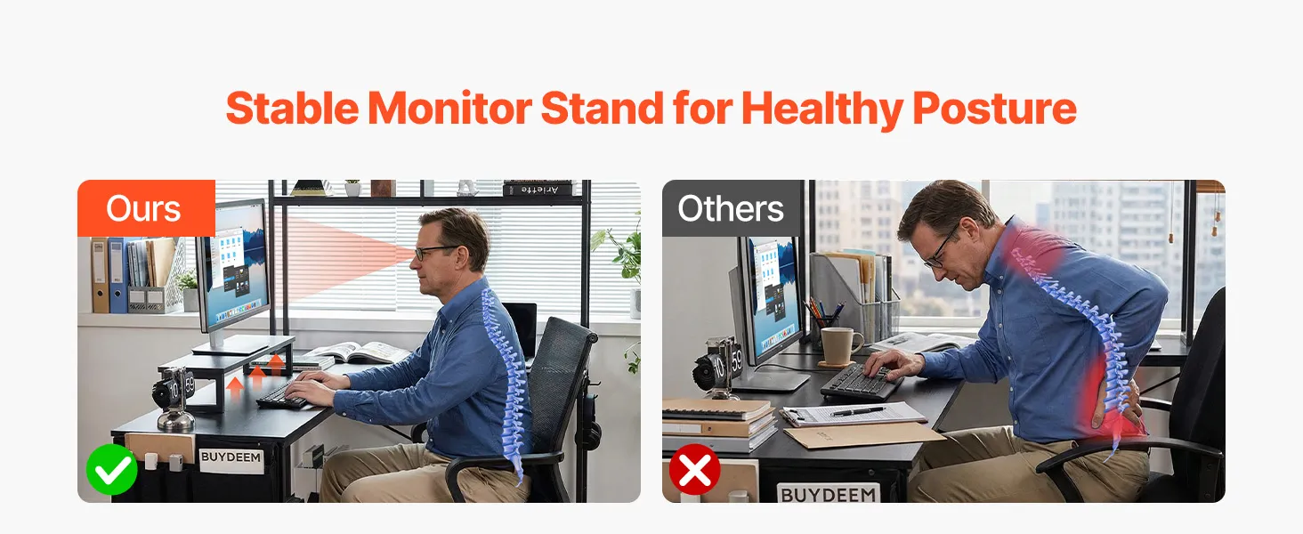 Ein stabiler Monitorständer hebt Ihren PC-Bildschirm auf eine angenehme Betrachtungshöhe und schafft gleichzeitig Platz auf dem Schreibtisch, wodurch ein saubererer und übersichtlicherer Arbeitsplatz entsteht.