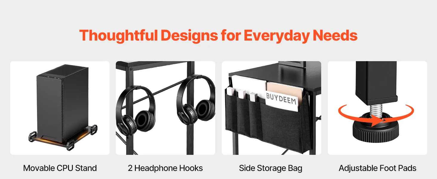 • Beweglicher CPU-Ständer: Hält Ihren Computer-Tower vom Boden fern und sorgt für bequemen Zugriff. Die flexible Positionierung passt sich nahtlos an Ihre Schreibtischkonfiguration an. Ein moderner PC-Tisch, der Ihren Arbeitsbereich stilvoll aufwertet und für Ordnung beim Arbeiten oder Spielen sorgt