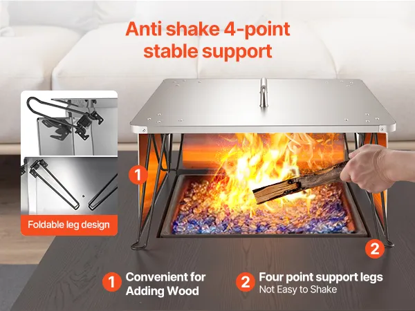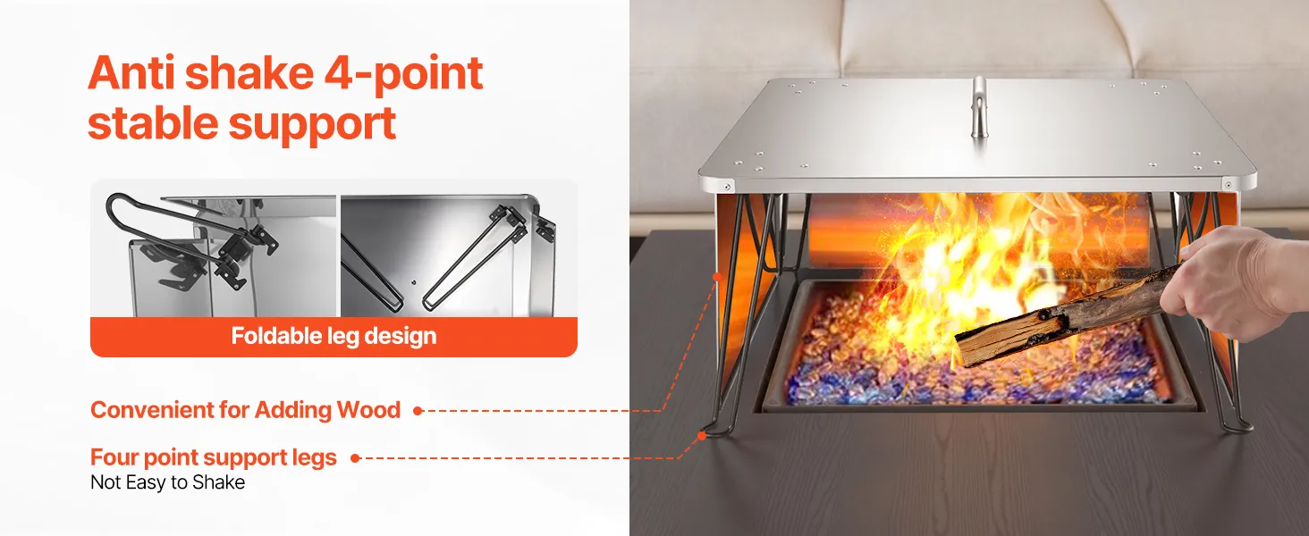 Stabiles Design: Das klappbare 4-Punkt-Beinsystem eignet sich für verschiedene Feuerstellentypen und verhindert ein Umkippen oder versehentliches Herunterfallen. Es passt sich sowohl festen Gartenfeuerstellen als auch tragbaren Campingkochern optimal an und sorgt für ein sichereres und stabileres Erlebnis.