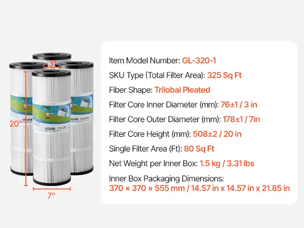 Kompatible Ersatzmodelle: Der Poolwasserfilter GL-320-1 ist mit folgenden Modellen kompatibel: VEVOR GL-320-1, CCP320, Pleatco PCC80-PAK4, Ultraf-A5, Unicel C-7470, R173573, Filbur FC-1976, 178580, 817-0081. Hinweis: Dies ist kompatibles Zubehör von Drittanbietern. Die aufgeführten Marken und Modelle dienen nur als Referenz. VEVOR ist eine unabhängige Marke.