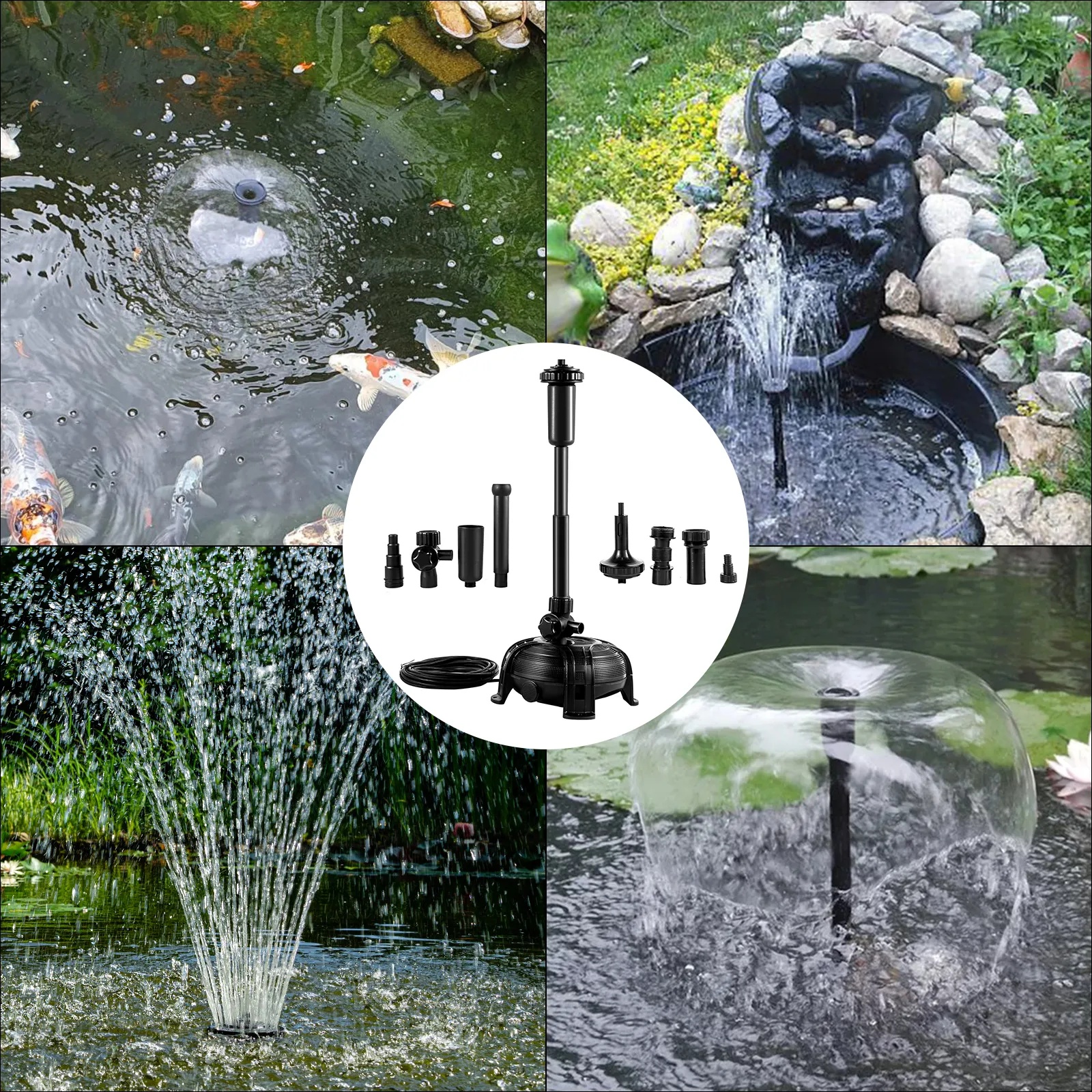 Die Gartenteichpumpe umfasst ein einzigartiges und umfassendes Sortiment an Armaturen und Brunnenköpfen. Es ist mit einem leistungsstarken Geschwindigkeitsfluss von 5000 L/H ausgelegt, um eine hohe Leistung zu erzielen. Die Teichpumpe wird häufig für Springbrunnen im Innen- und Außenbereich verwendet, um Ihren Teich und Garten zu dekorieren.