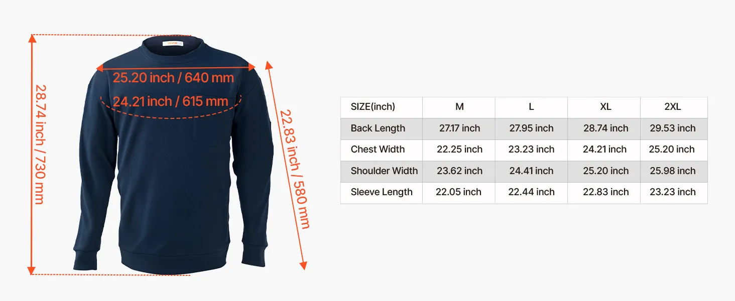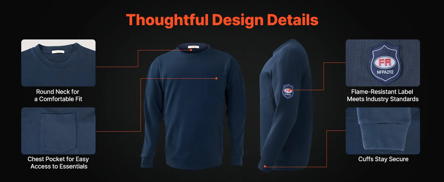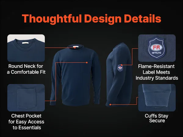 Der klassische Rundhalsausschnitt bietet eine bequeme Passform. Eine Brusttasche bietet schnellen Zugriff auf Ausweise, Stifte oder kleine Werkzeuge. Die flammhemmende Kennzeichnung gewährleistet die Einhaltung der Branchenvorschriften, während das saubere Bündchendesign ein Durchhängen verhindert.