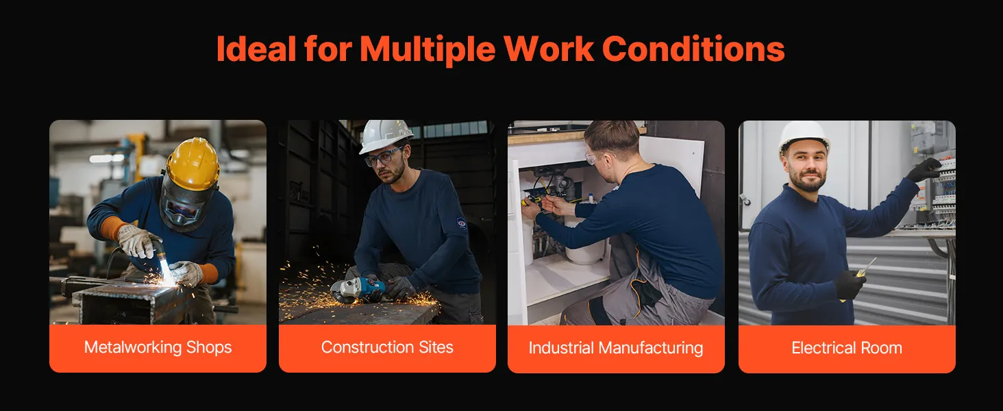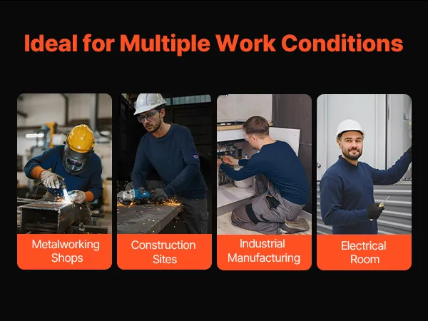 Ideal für Metallwerkstätten, Baustellen, Produktionsanlagen und elektrische Verteilerräume – überall dort, wo Funken- oder Lichtbogengefahr besteht. Entwickelt für Schweißer, Elektriker, Leitungsmonteure und mehr.