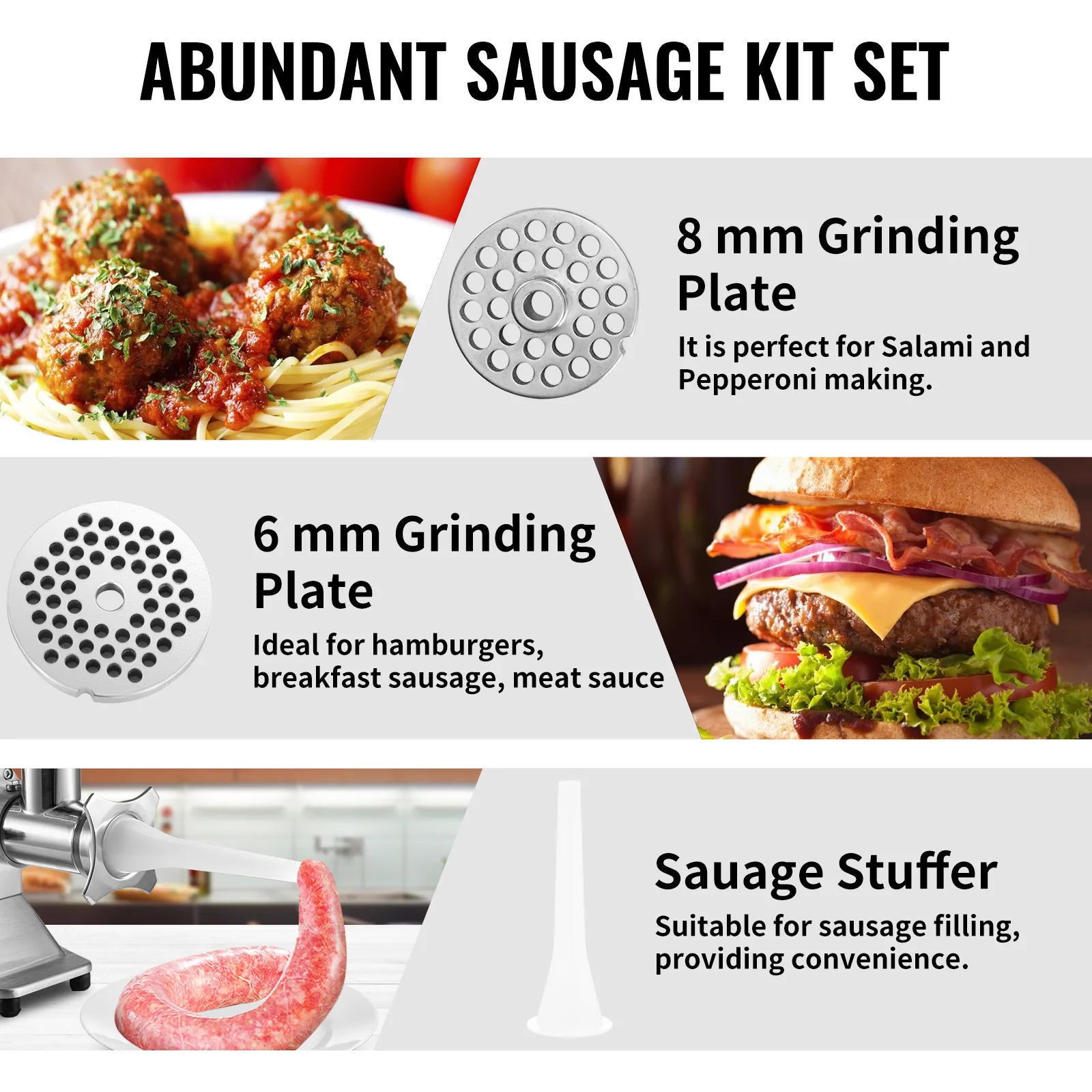 Wir bieten Ihnen komplettes Zubehör wie eine 6-mm-Schleifplatte, eine 8-mm-Schleifplatte, 2 scharfe Klingen, ein Fleischtablett, einen Hals, eine Schubstange, ein Wurstset und einige Installationskomponenten.