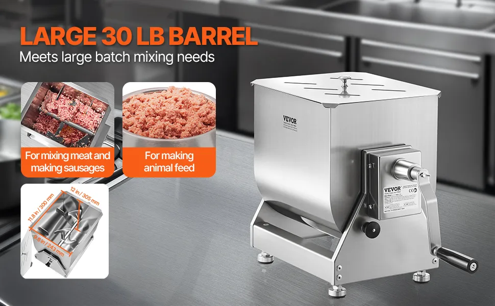Tank mit großem Fassungsvermögen: Der Mischtank kann ungefähr 30 lbs (13,61 kg) Fleischzutaten aufnehmen. Er ist ideal für die groß angelegte Wurstproduktion, andere Delikatessen oder sogar die Zubereitung von Tierfutter. Das Kippdesign erleichtert das Entladen des Fleisches