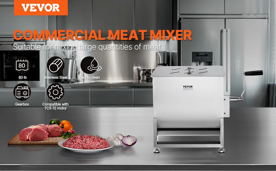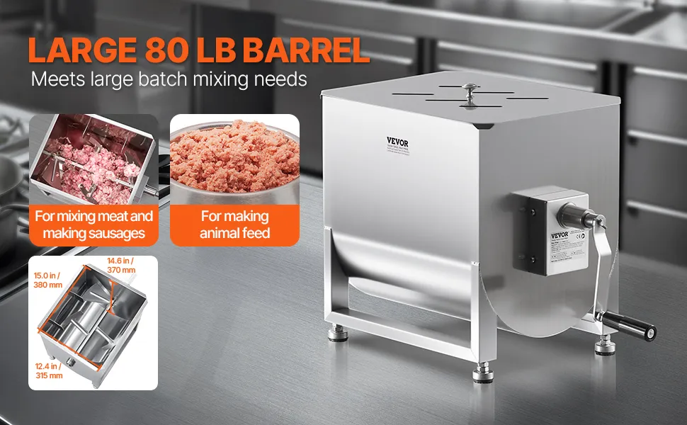 Der Fleischmischer verfügt über einen Tank mit 36,29 kg Fassungsvermögen und ist ideal zum Mischen von Fleisch mit Soßen und Gewürzen. Er kann zur Herstellung von Würstchen und anderen Delikatessen oder sogar zur Zubereitung von Tierfutter verwendet werden.