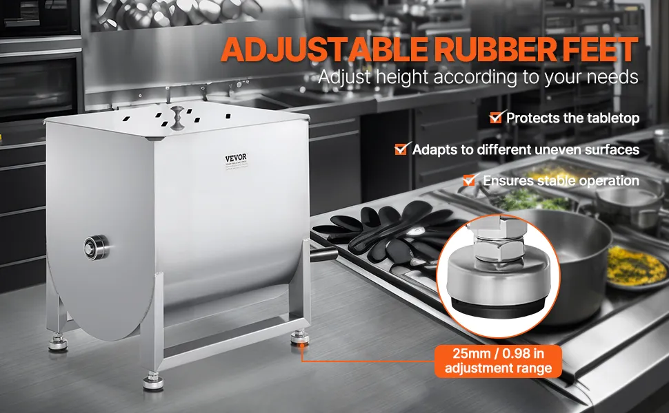 Der kommerzielle manuelle Fleischmixer ist mit verstellbaren Gummifüßen ausgestattet, die eine Höhenverstellung von 25 mm ermöglichen. Dieses Design schützt die Oberfläche und gewährleistet gleichzeitig einen stabilen Betrieb.