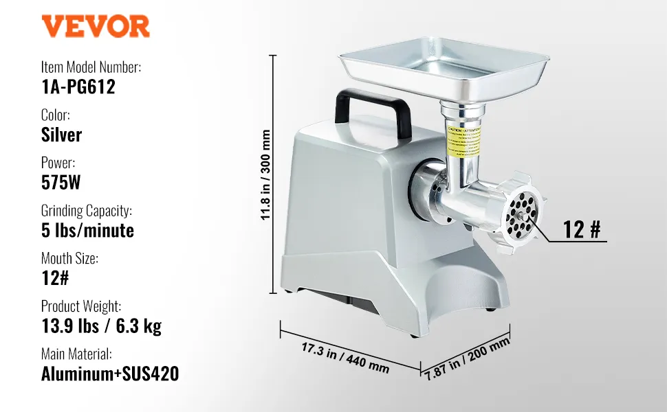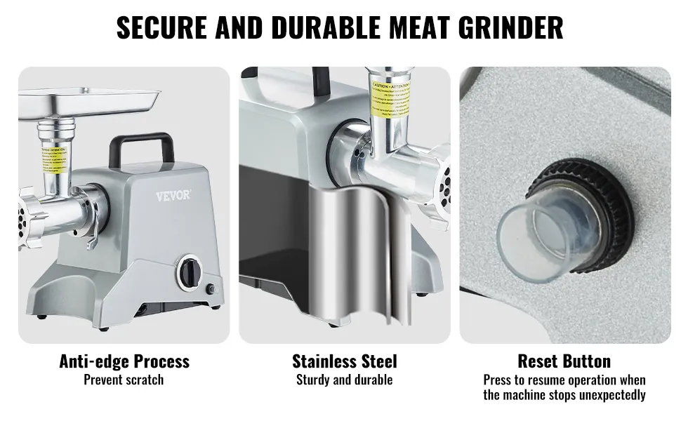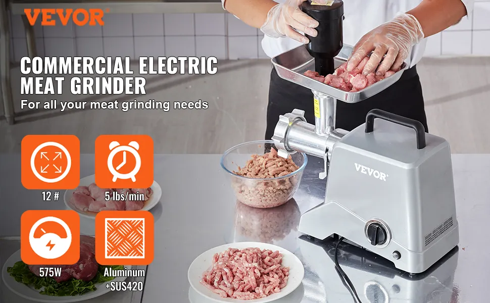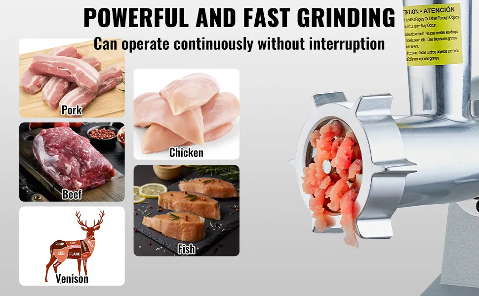 Dieser Fleischwolf hat eine Spitzenleistung von 800 W und eine Nennleistung von 575 W. Er kann bis zu 2,27 kg Fleisch pro Minute mahlen! Arbeitet über 30 Minuten ununterbrochen. Er ist ein zuverlässiger Helfer, um Hackfleisch schnell und effizient zu Hause zuzubereiten!
