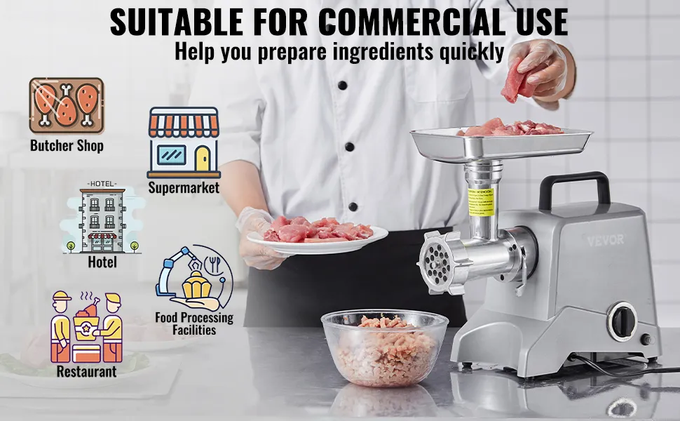 Gut gebaut: Mit Aluminiumkonstruktion, der Teil, der mit Lebensmitteln in Berührung kommt, besteht aus 100 % lebensmittelechtem Material; die Anti-Backloading-Einstellung der Klinge hilft Ihnen, richtig zu arbeiten, außerdem können Sie die schnelle und langsame Geschwindigkeit einstellen; die Umkehrfunktion hilft Ihnen, schnell zur normalen Arbeit zurückzukehren, wenn sich Fleisch verklemmt hat