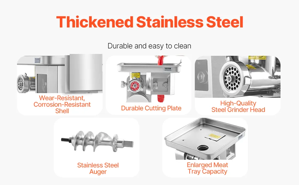 Ideal für den gewerblichen Einsatz: Der aus dickem Edelstahl gefertigte Fleischwolfkörper ist robust und langlebig, leicht zu reinigen und für verschiedene Umgebungen wie Küchen, Restaurants und Unternehmen geeignet. Er ist der ideale Helfer für Mahl- und Schneideaufgaben. Egal, ob Sie Würstchen oder Fleischpasteten herstellen möchten, dieser Fleischwolf und -schneider bietet zahlreiche Optionen für Ihre kulinarischen Kreationen