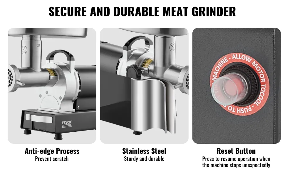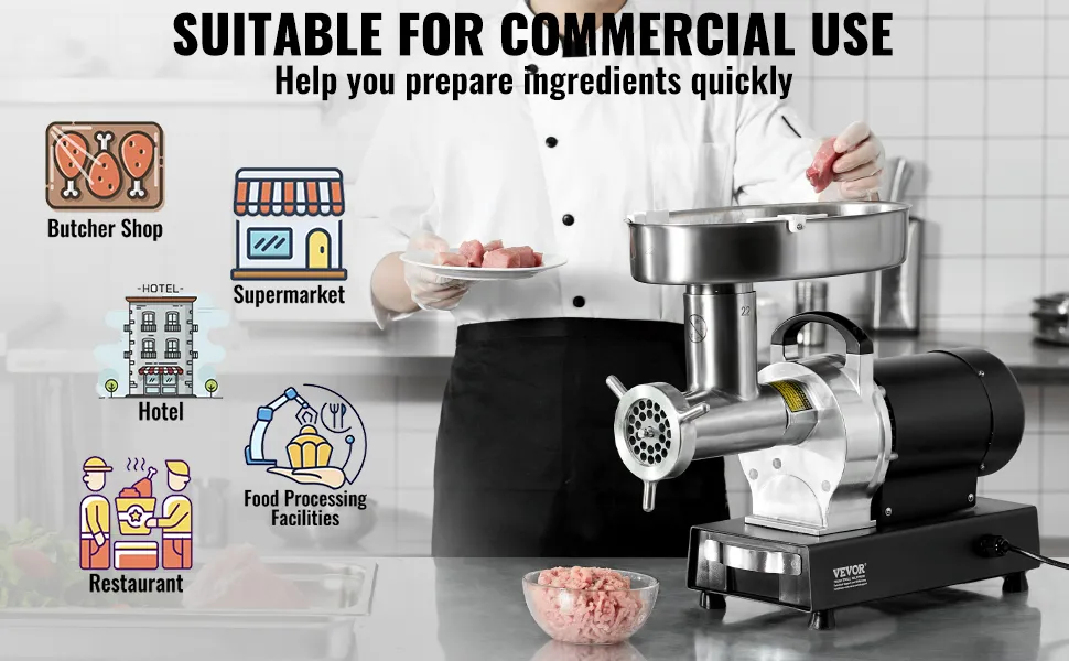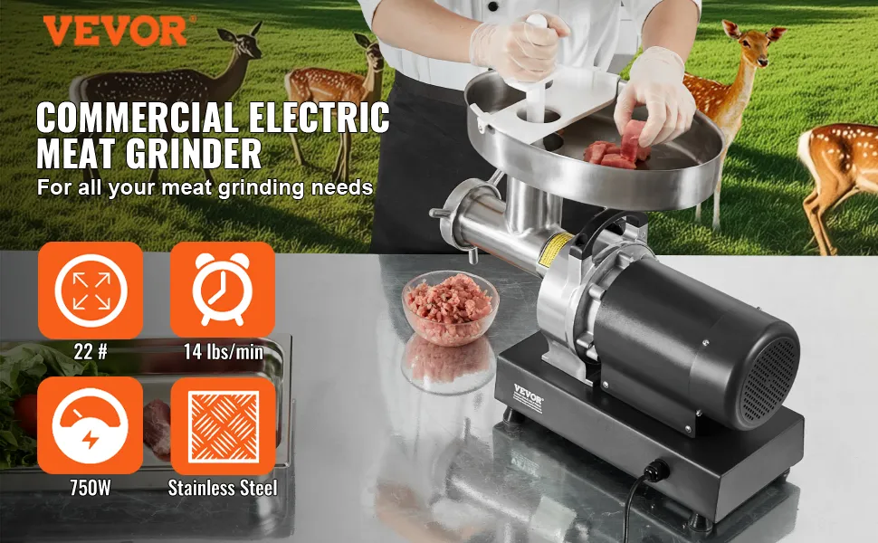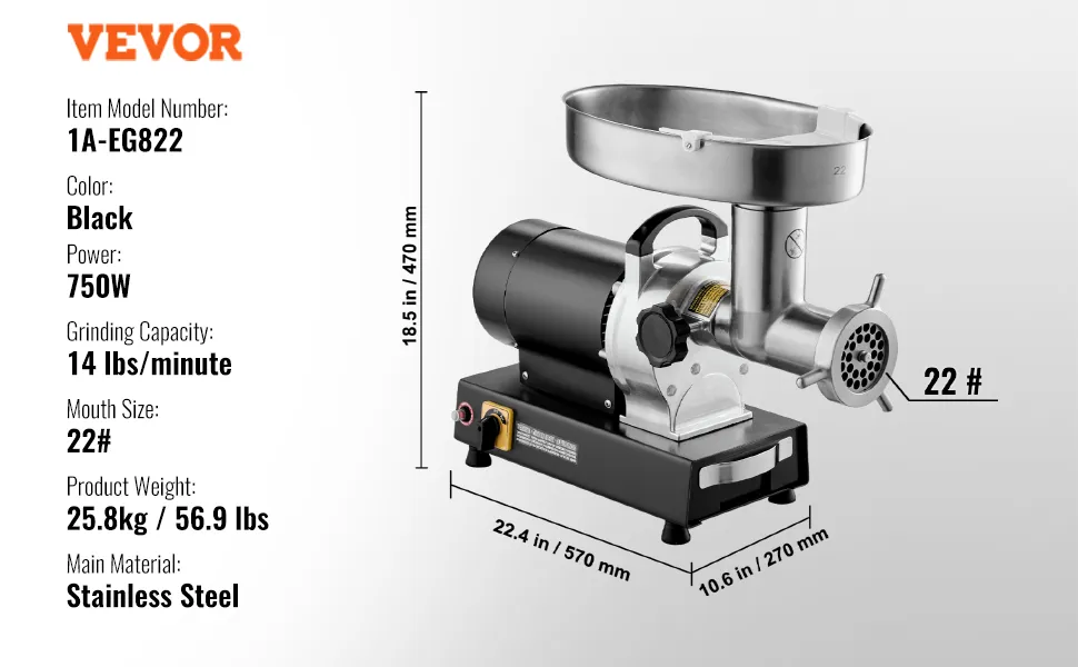 Der Fleischwolf mit einer Öffnung von 22# ist mit einem hocheffizienten 750-W-Motor aus reinem Kupfer ausgestattet, der 6,35 kg Fleisch pro Minute zerkleinern kann. Er ist aus rostfreiem Stahl gefertigt, robust und langlebig. Das SUS420-Messer kann verschiedene Fleischsorten zerkleinern.