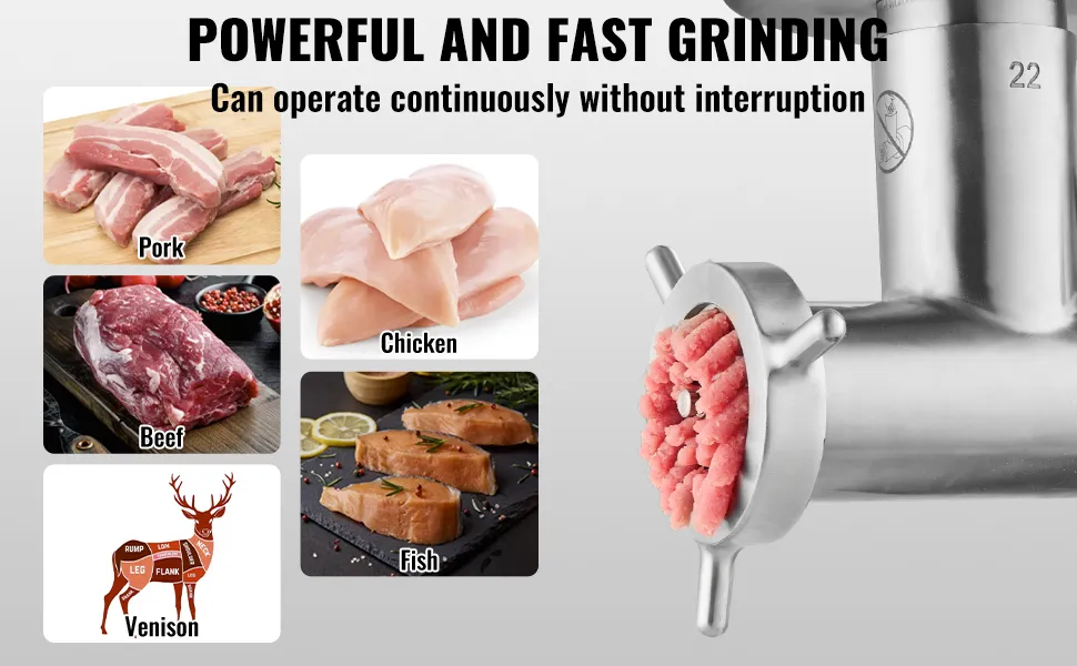 Der 750-W-Motor aus reinem Kupfer kann 6,35 kg Fleisch pro Minute zerkleinern. Der elektrische Fleischwolf kann kontinuierlich und ohne Unterbrechungen arbeiten und ist daher ideal für das Zerkleinern von Fleisch in großen Mengen.