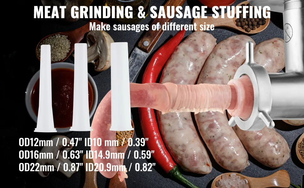 Der Profi-Fleischwolf verfügt über Wurstrohre mit drei verschiedenen Durchmessern, sodass Sie problemlos Würste in verschiedenen Größen herstellen können. Ideal für den Einsatz in Küchen, Bars, Restaurants und lebensmittelverarbeitenden Betrieben.