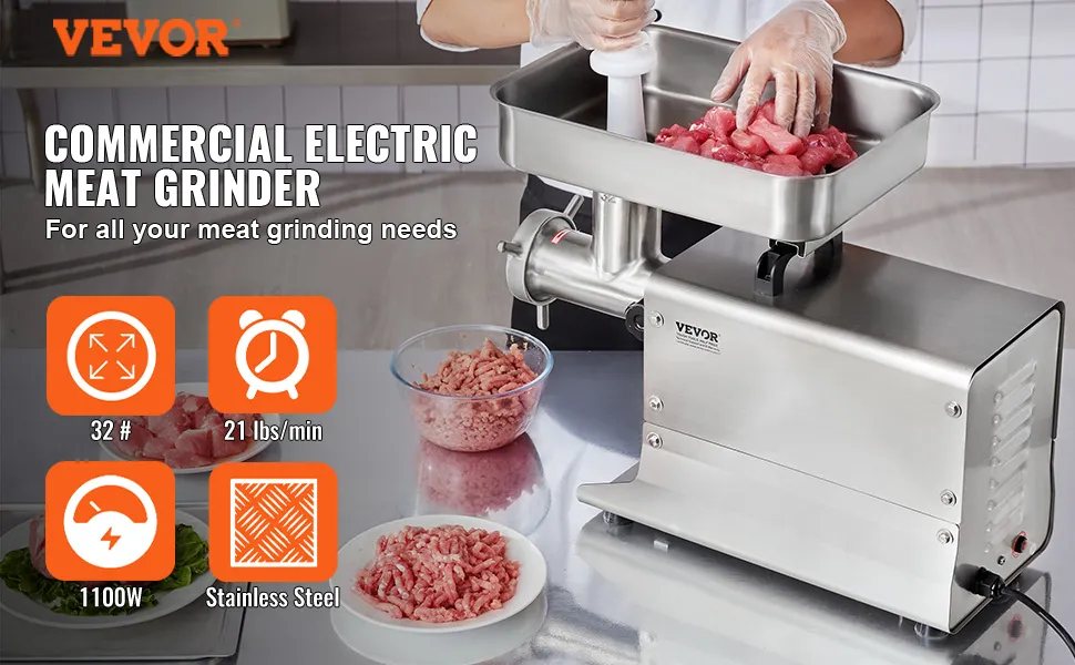 Schnelles Zerkleinern: Der kommerzielle Fleischwolf für die Arbeitsplatte, Öffnungsgröße 32#, verfügt über einen hocheffizienten 1100-W-Motor aus reinem Kupfer, der 21 lbs (9,53 kg) Fleisch pro Minute zerkleinern kann. Er kann kontinuierlich ohne Unterbrechung laufen und ist daher ideal für groß angelegte kommerzielle Fleischwolfarbeiten. Lassen Sie den Wolf nicht zu lange im Leerlauf laufen, da dies den Motor beschädigen kann.