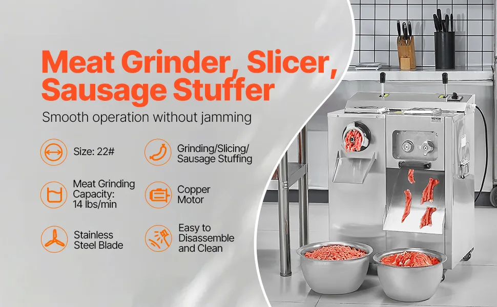 3 in 1 Multifunktion: Der kommerzielle Fleischwolf und -schneider hat ein Kaliber von #22 und ist damit eine vielseitige Maschine zum Zerkleinern von Fleisch und Gemüse ohne Verklemmen. Schneiden, zerkleinern und würfeln Sie gleichmäßig und mit gleichbleibender Leistung, um gleichmäßige Fleischergebnisse und effizienteres Füllen von Wurstwaren zu erzielen – ideal für die schnelle Zubereitung verschiedener Würste und Wurstwaren