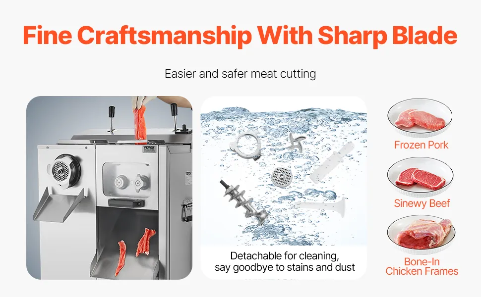 Die dicke, scharfe Klinge ermöglicht schnelles Schneiden und erleichtert das Fleischwolfen. Die abnehmbare Klinge ermöglicht das einfache Entfernen von Fleischresten, Fett und Flecken.