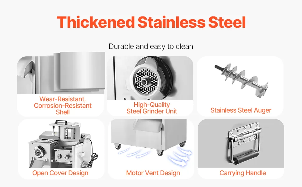 Ideal für den gewerblichen Einsatz: Der aus dickem Edelstahl gefertigte Fleischwolfkörper ist robust und langlebig, leicht zu reinigen und für verschiedene Umgebungen wie Küchen, Restaurants und Unternehmen geeignet. Er ist der ideale Helfer für Mahl- und Schneideaufgaben. Egal, ob Sie Würstchen oder Fleischpasteten herstellen möchten, dieser Fleischwolf und -schneider bietet zahlreiche Optionen für Ihre kulinarischen Kreationen